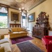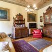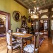 Al centro della stanza, un elegante lampadario sospeso aggiunge un tocco di sontuosità, illuminando con grazia i dettagli finemente lavorati degli arredi, tra cui spiccano un sofà in velluto e sedie intarsiate, simboli di un'arte artigianale che attraversa i secoli.