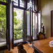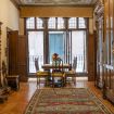 Il salone, con i suoi alti soffitti decorati da dettagli in legno intagliato e il pavimento in parquet a spina di pesce, è un esempio perfetto di architettura classica veneziana. Gli ampi finestroni, impreziositi da vetrate artistiche, si affacciano su un giardino rigoglioso, donando una luce naturale che esalta i caldi toni dorati delle pareti e i ricchi arredi d'epoca.