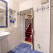 Bagno di servizio presenta un design elegante e luminoso, caratterizzato da piastrelle bianche che rivestono le pareti e il pavimento. Le piastrelle sono arricchite da un motivo decorativo blu, che aggiunge un tocco di colore e carattere all'ambiente. Il pavimento in piastrelle blu intenso crea un piacevole contrasto con il resto del bagno, conferendo un aspetto ordinato e fresco. Questo bagno è esterno all'appartamento e si trova in uno spazio ricavato tra le scale e non è dotato di riscaldamento.