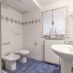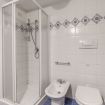 Il lavabo è incorniciato da uno specchio con una cornice blu decorativa, che riprende il motivo delle piastrelle, e offre un ampio spazio per la cura personale. Il bagno è dotato di tutti i comfort necessari, tra cui una doccia con cabina in vetro, un bidet e un WC, tutti disposti in modo funzionale per massimizzare lo spazio disponibile.