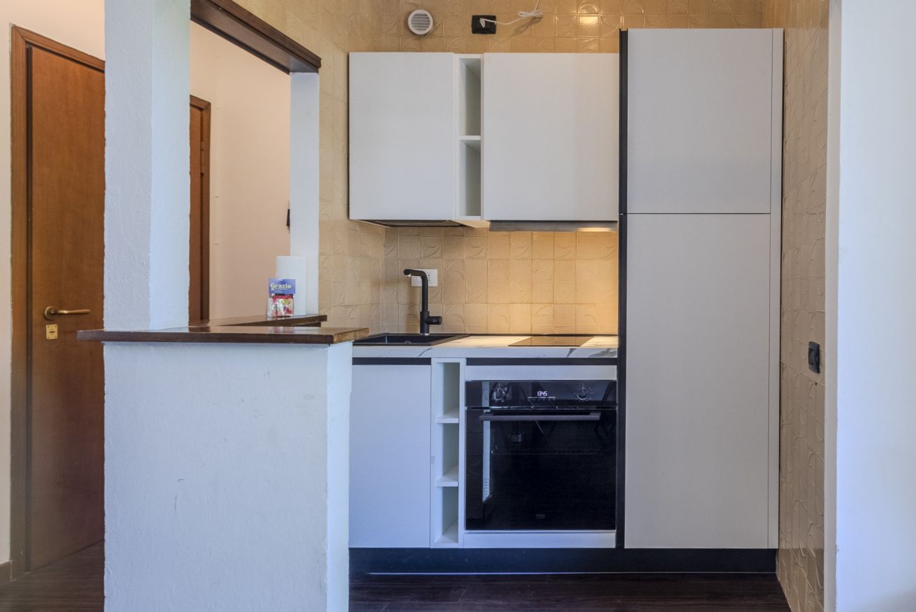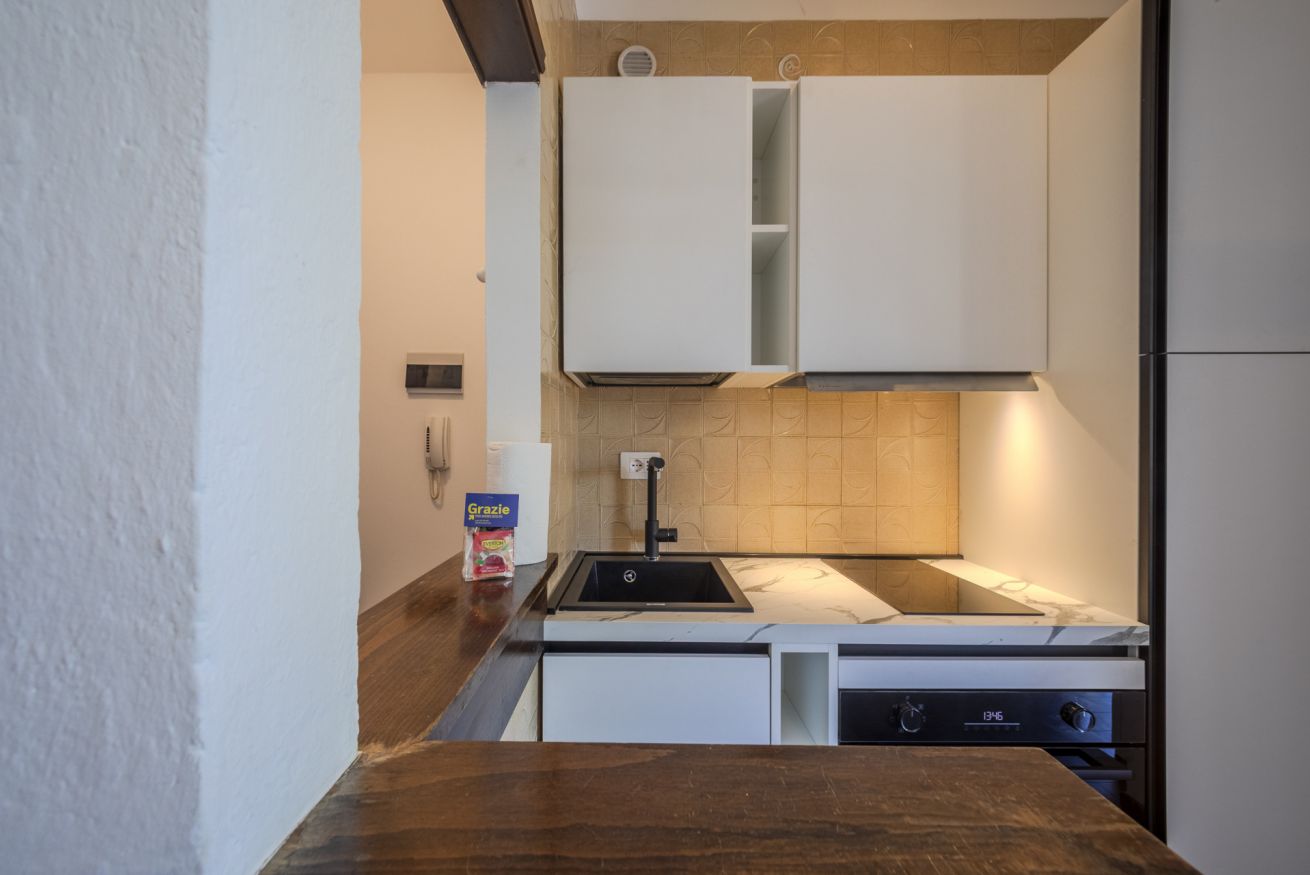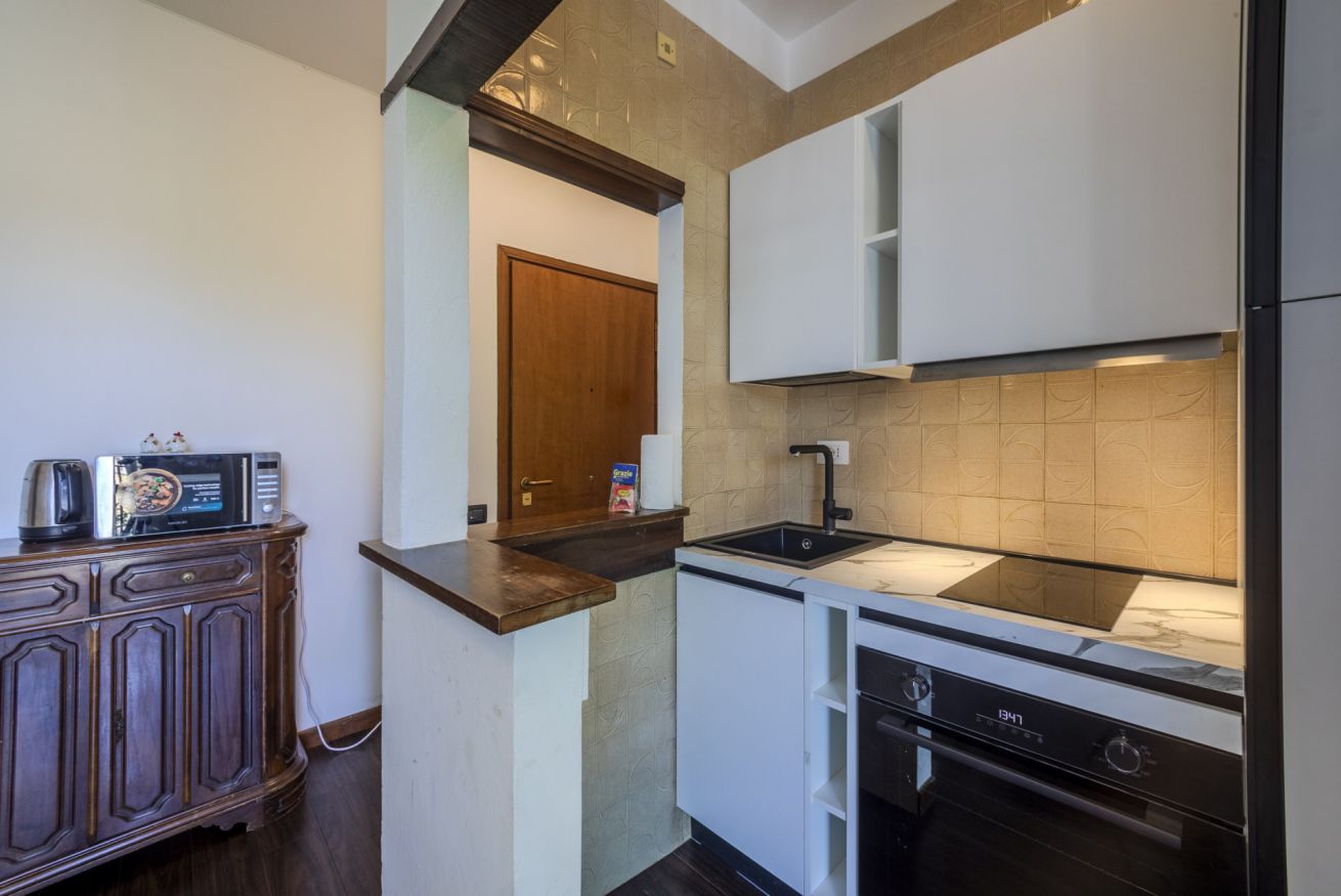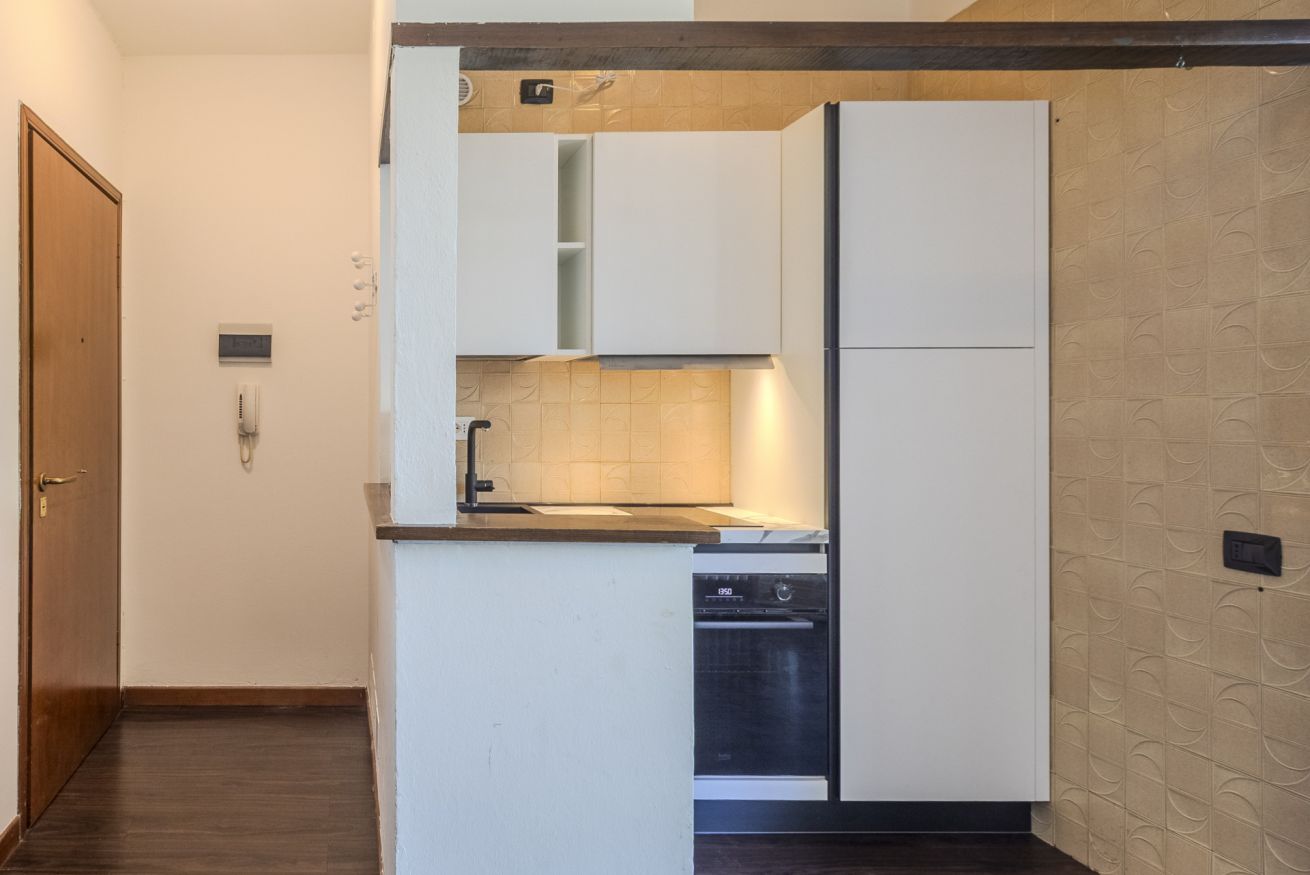 La cucina, come anche la camera da letto, affacciano su una grande terrazza privata di oltre 20mq con lavatoio.