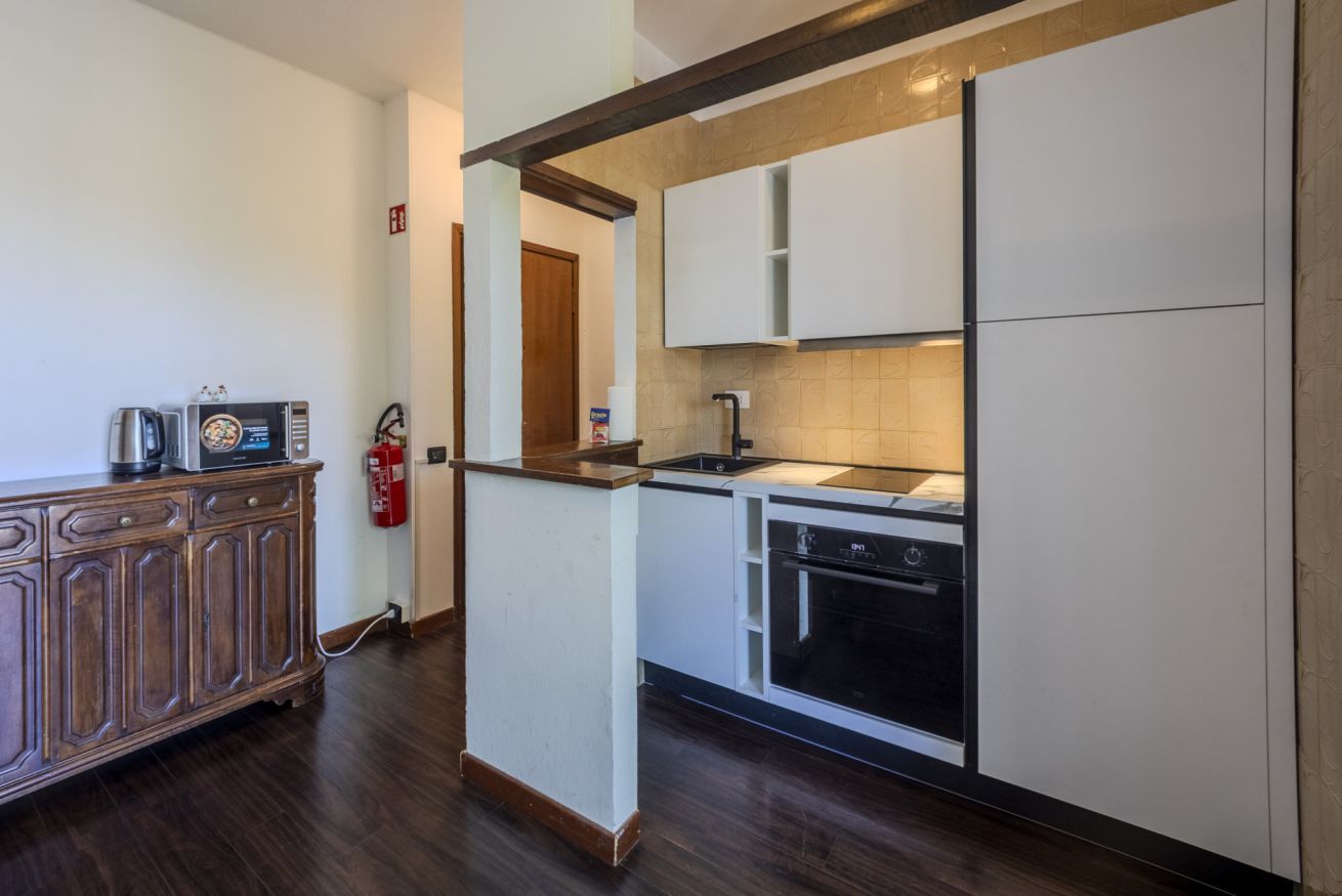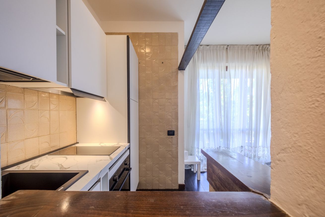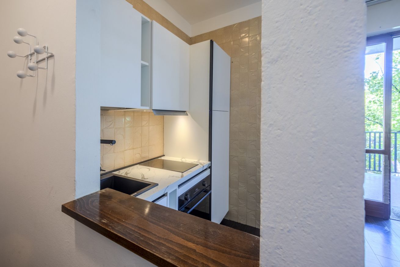 La cucina, come anche la camera da letto, affacciano su una grande terrazza privata di oltre 20mq con lavatoio.