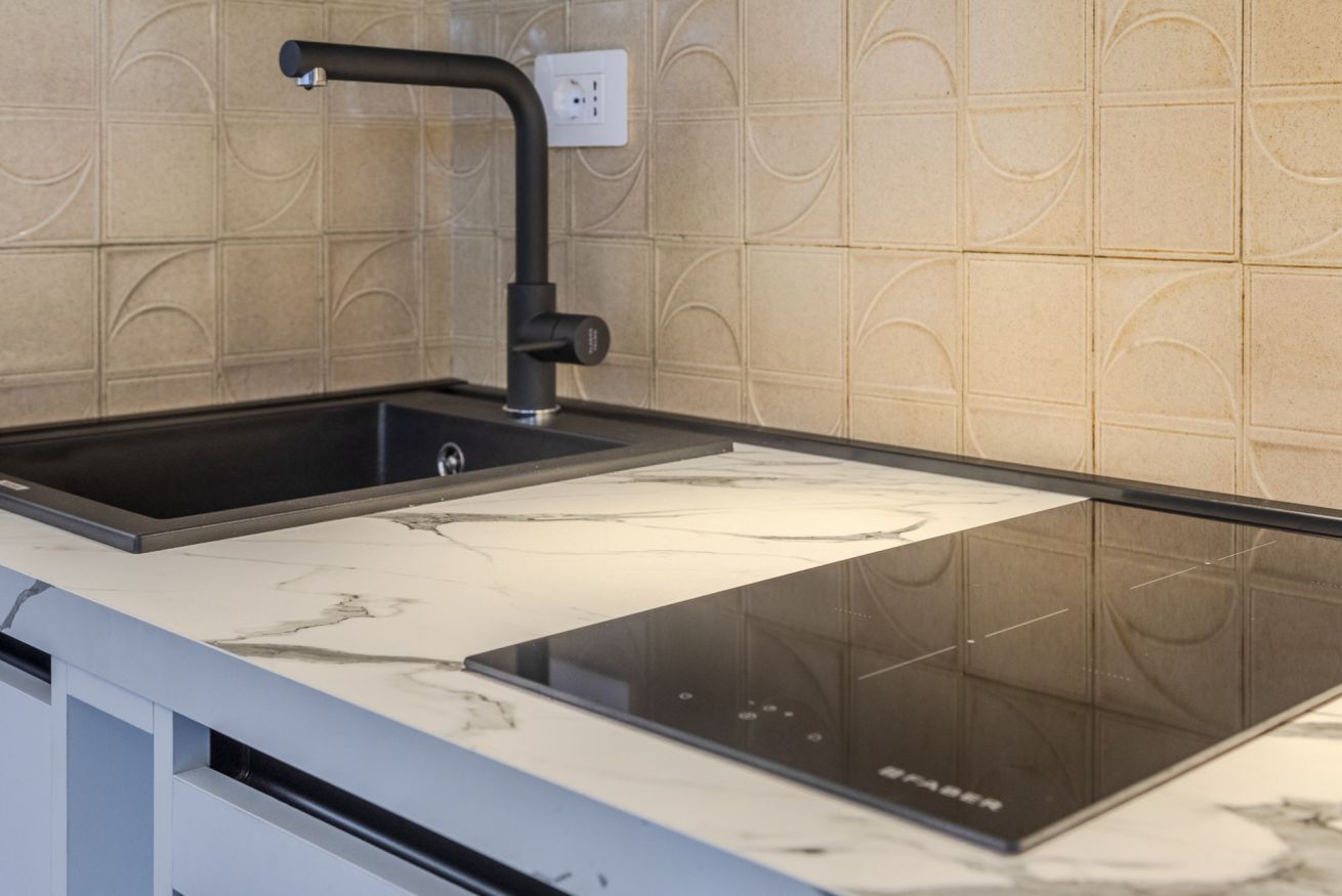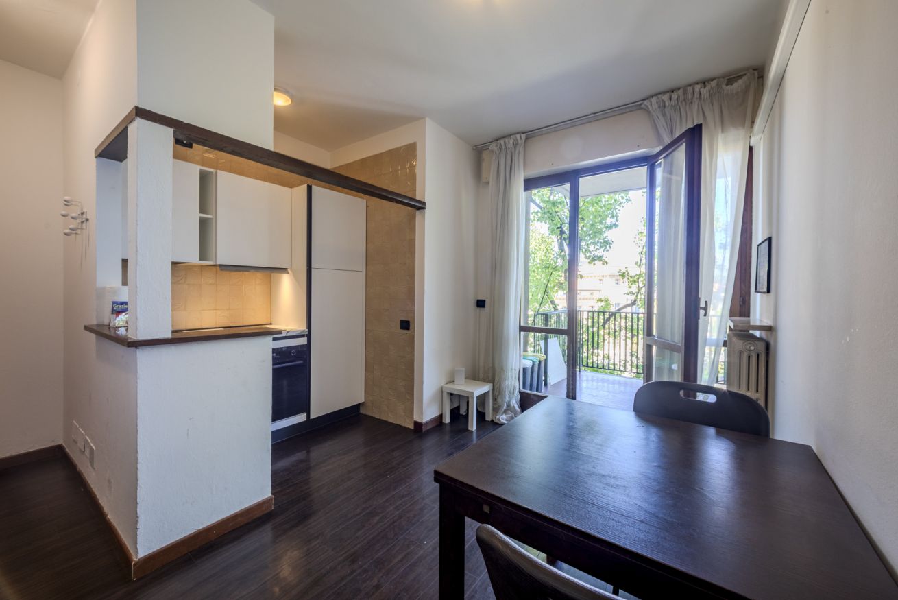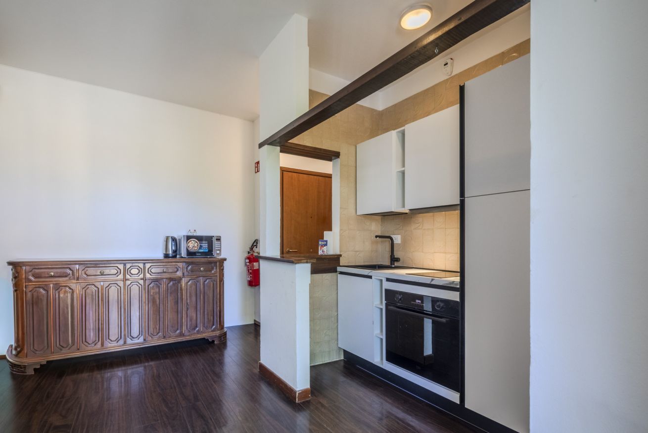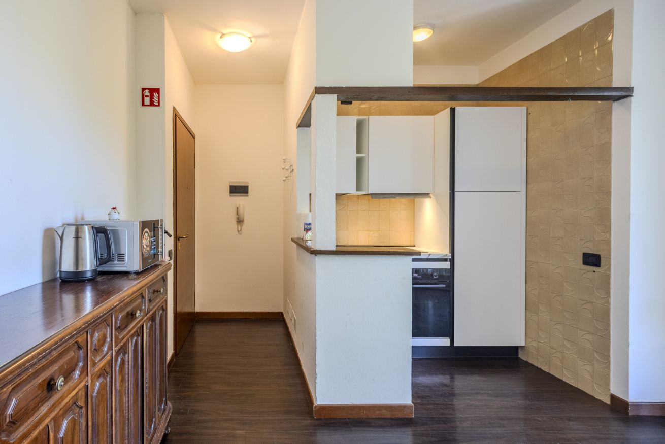 La cucina, come anche la camera da letto, affacciano su una grande terrazza privata di oltre 20mq con lavatoio.
