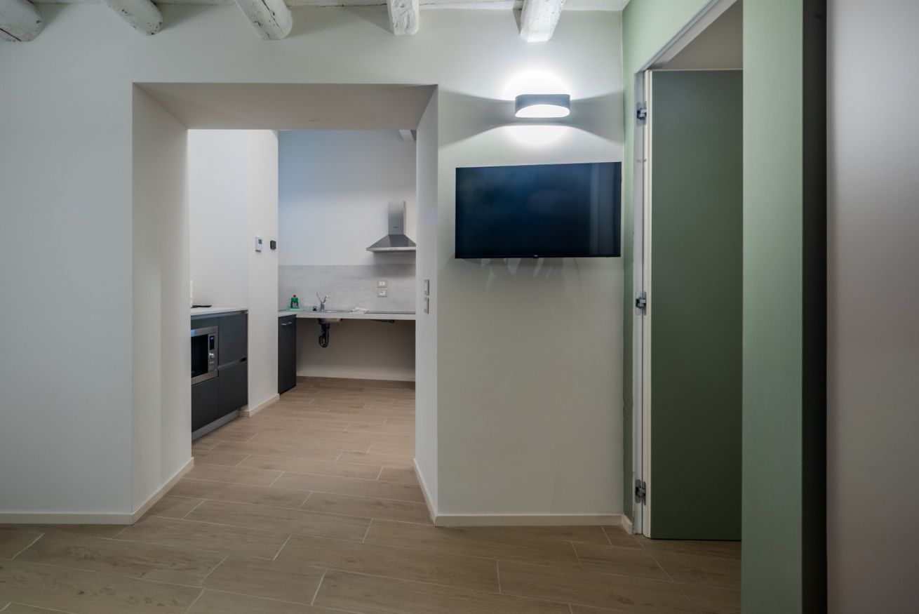 L’appartamento è stato progettato per accogliere sia ospiti con disabilità motorie sia ospiti senza difficoltà di deambulazione(ampiezza porte 79 cm) , offrendo spazi ampi, funzionali e privi di barriere. Tutti gli ambienti principali si sviluppano su un unico livello, senza gradini interni, con passaggi comodi e superfici continue che garantiscono libertà di movimento e comfort.