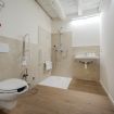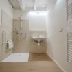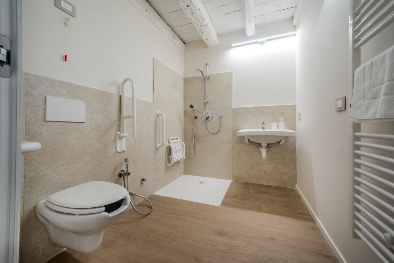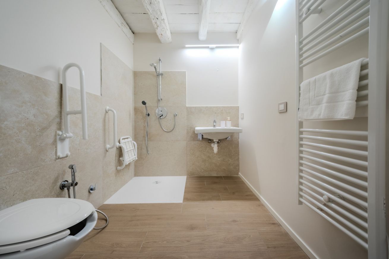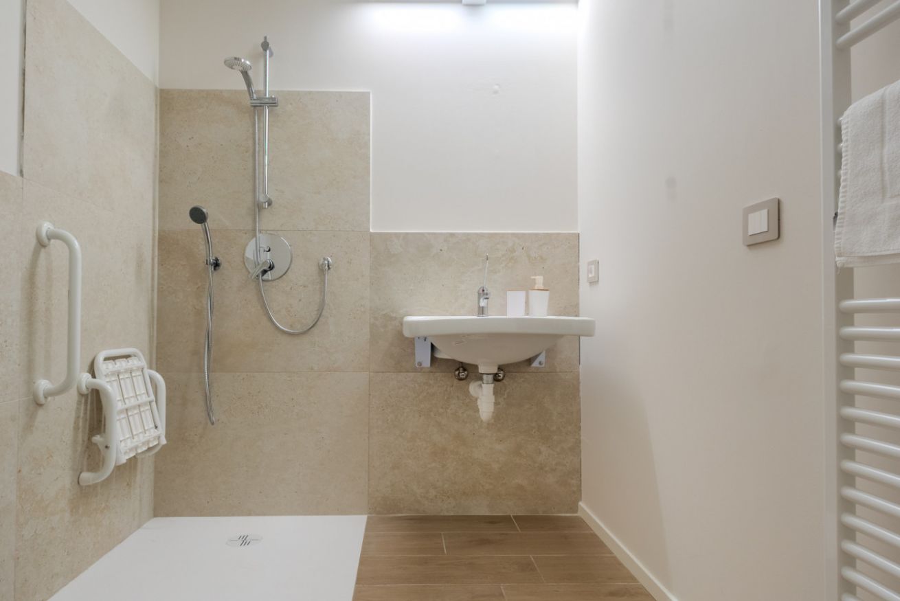 Il bagno è completamente accessibile e pensato per garantire sicurezza e praticità: doccia a filo pavimento, seduta ribaltabile, maniglioni di supporto e spazi di manovra adeguati. Una soluzione funzionale per ospiti con mobilità ridotta, ma apprezzata anche da chi desidera un bagno moderno, ampio e senza ingombri.