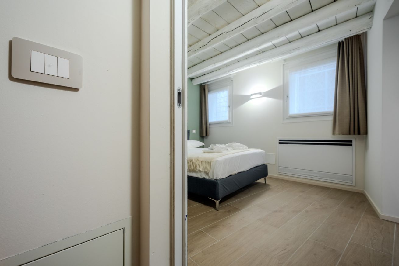 La camera matrimoniale è silenziosa e accogliente, con spazi ampi attorno al letto che facilitano gli spostamenti e le manovre. Il letto, confortevole e facilmente accessibile, rende l’ambiente adatto a ogni tipo di ospite, offrendo un riposo piacevole e senza compromessi.