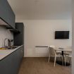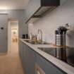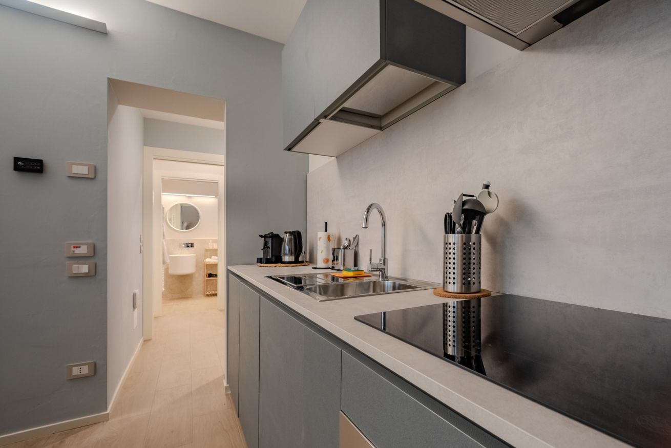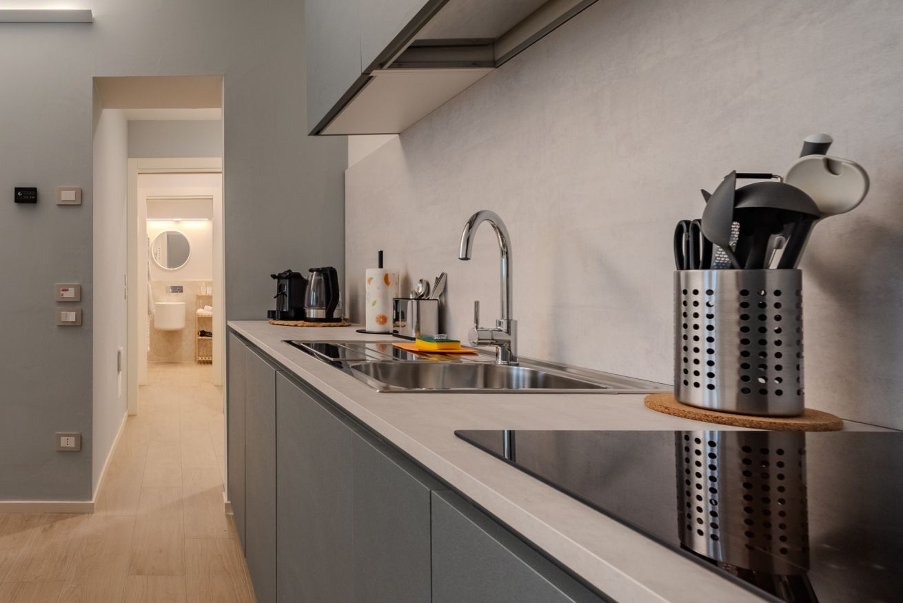 È dotata di piano cottura a induzione, forno, lavastoviglie, frigorifero, oltre a piccoli elettrodomestici e utensili accuratamente selezionati.