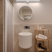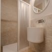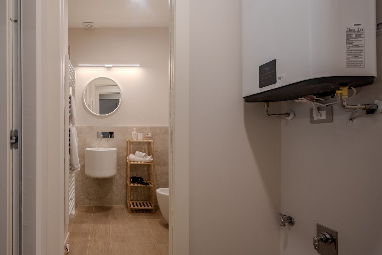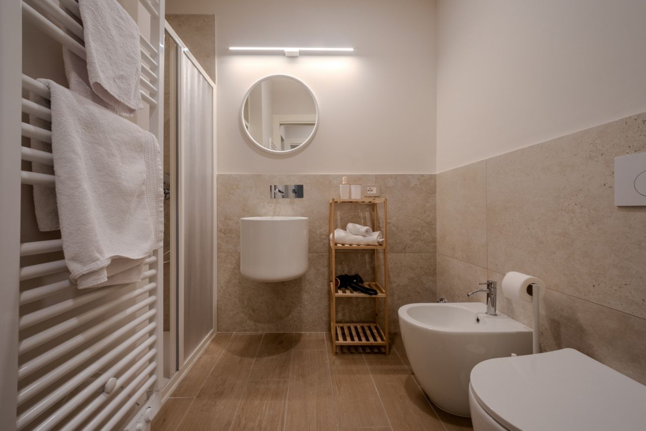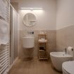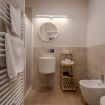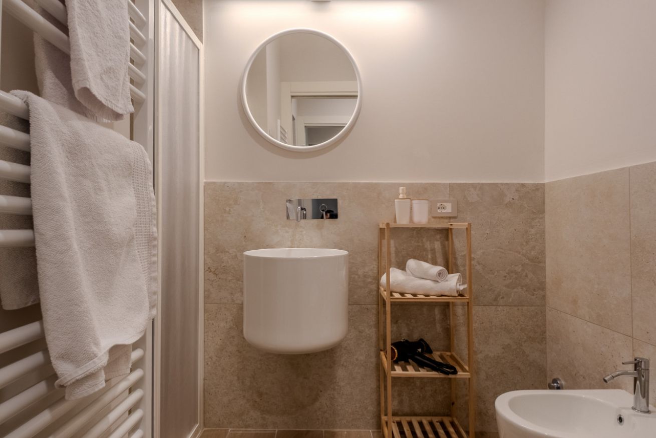 È presente una doccia spaziosa, lavabo sospeso con specchio illuminato, bidet, scaldasalviette e comodi appoggi per asciugamani e oggetti personali.