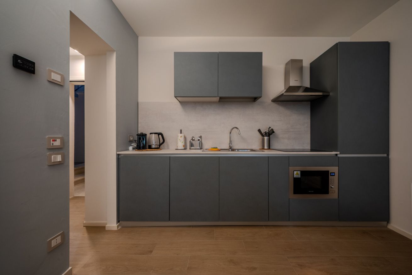 La cucina è moderna, lineare e perfettamente integrata nella zona living.