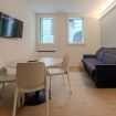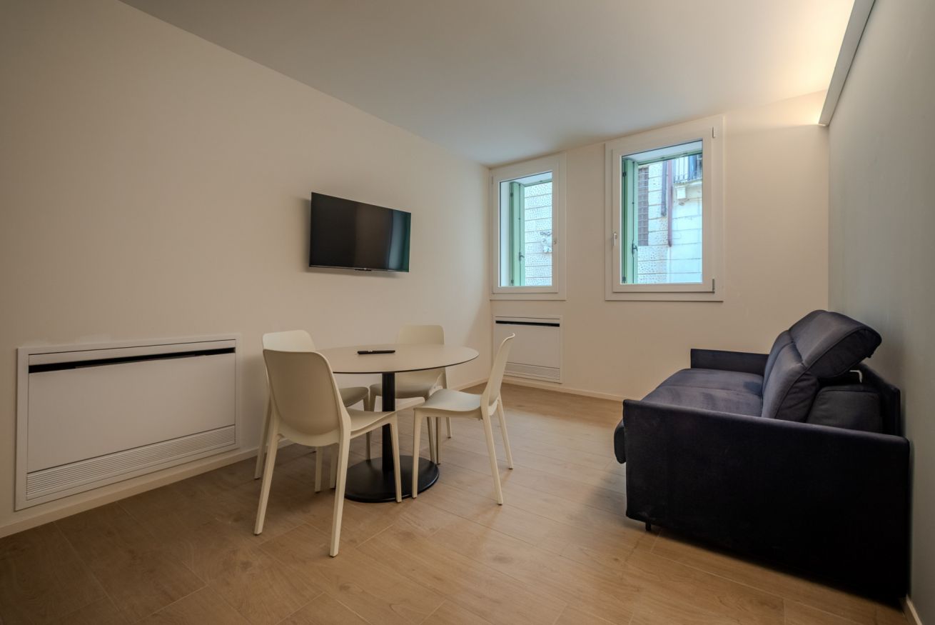 Sulla parete, la TV a schermo piatto è posizionata in modo discreto, mentre il divano offre una comoda area relax dopo una giornata in città.