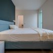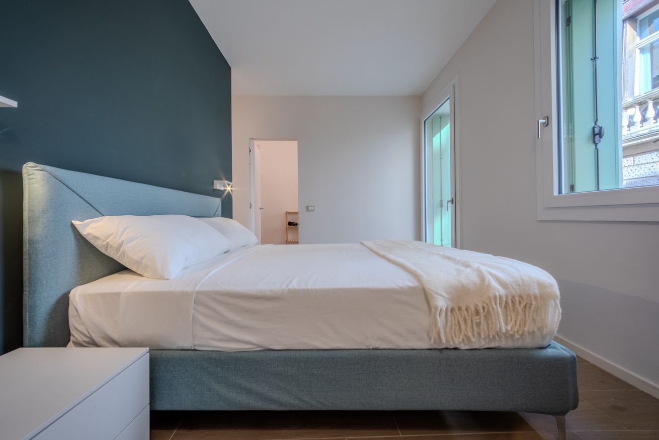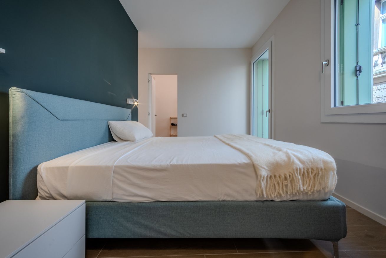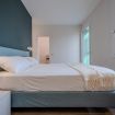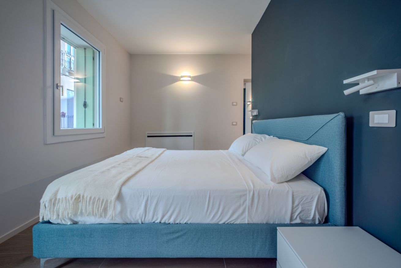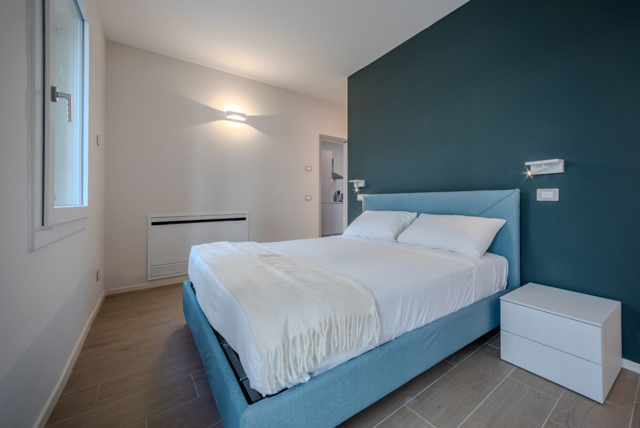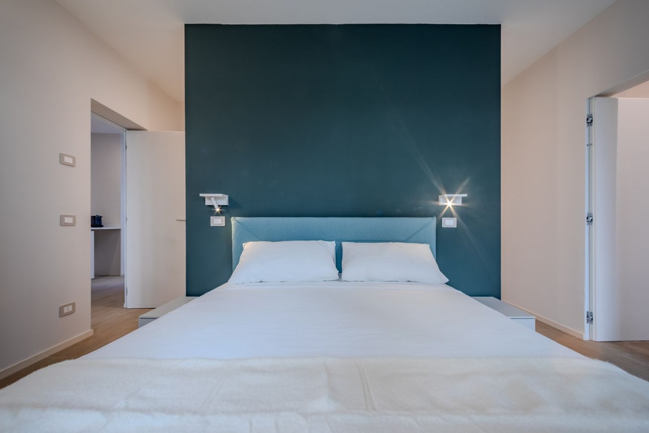 La camera matrimoniale è uno spazio intimo e rilassante, caratterizzato da una palette cromatica elegante e avvolgente.