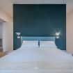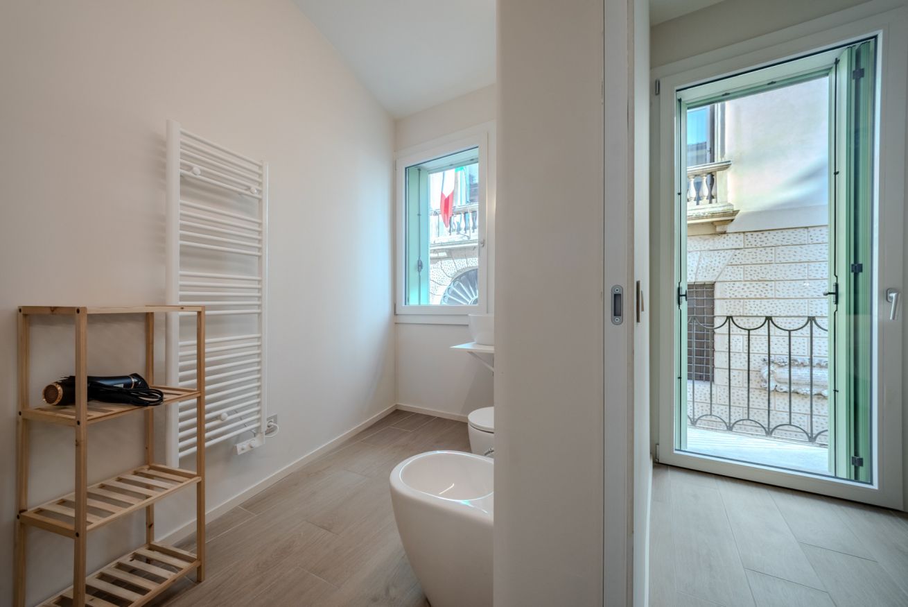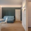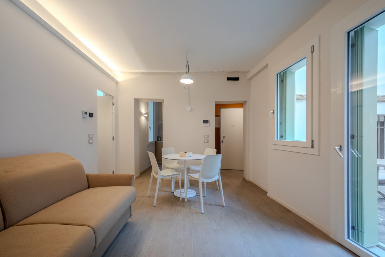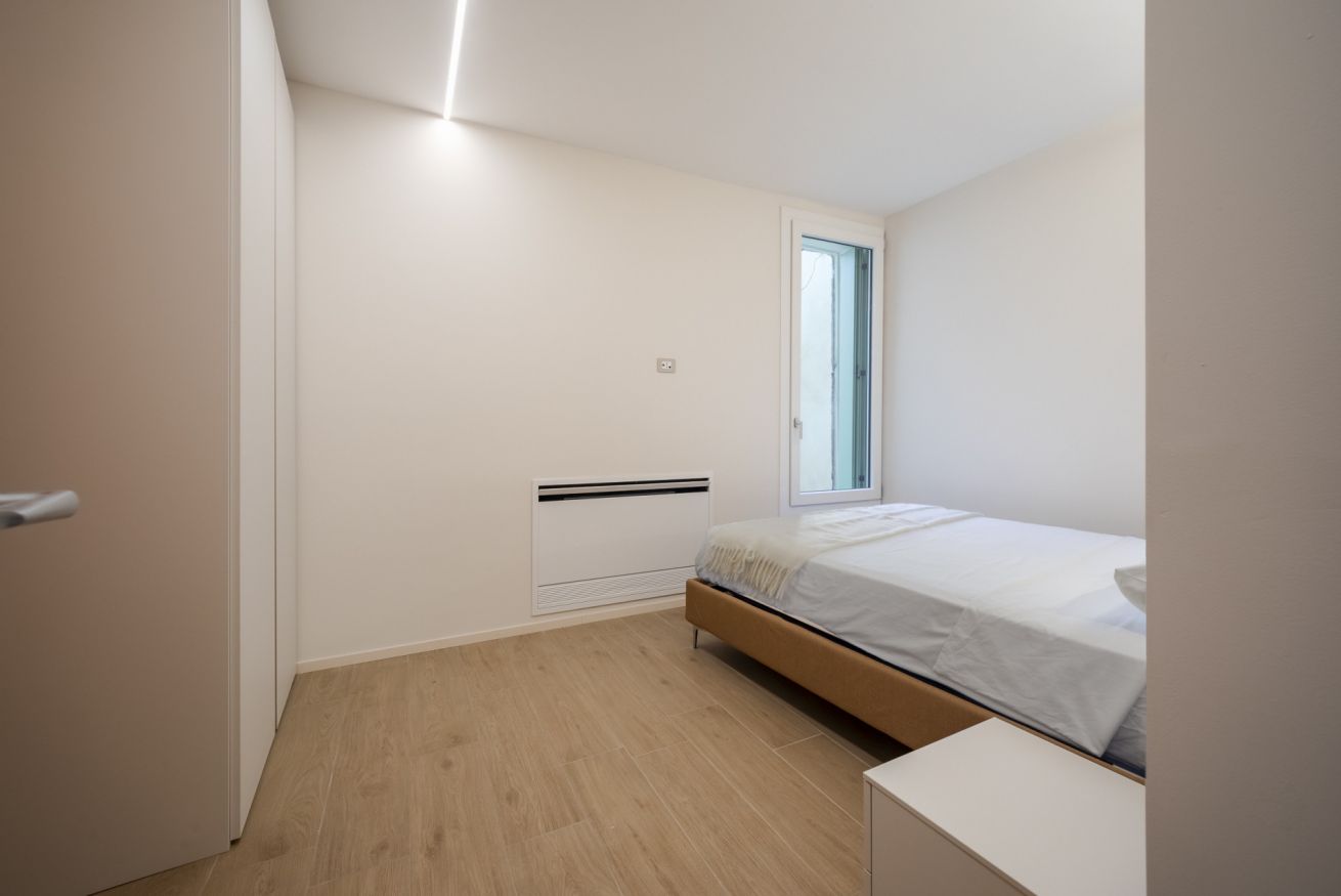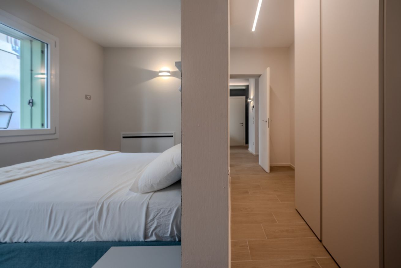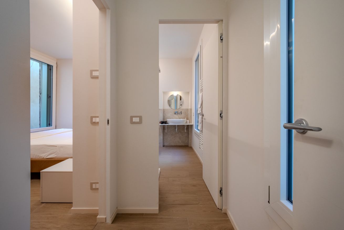 L’illuminazione è studiata per creare un’atmosfera calma e accogliente, mentre le finestre assicurano luce naturale e un affaccio silenzioso sul contesto storico circostante.