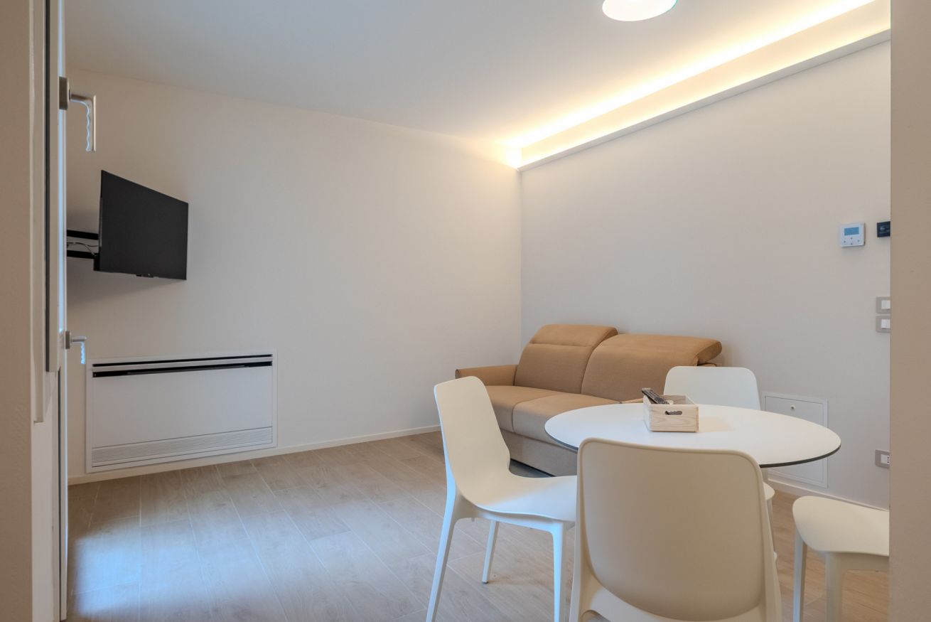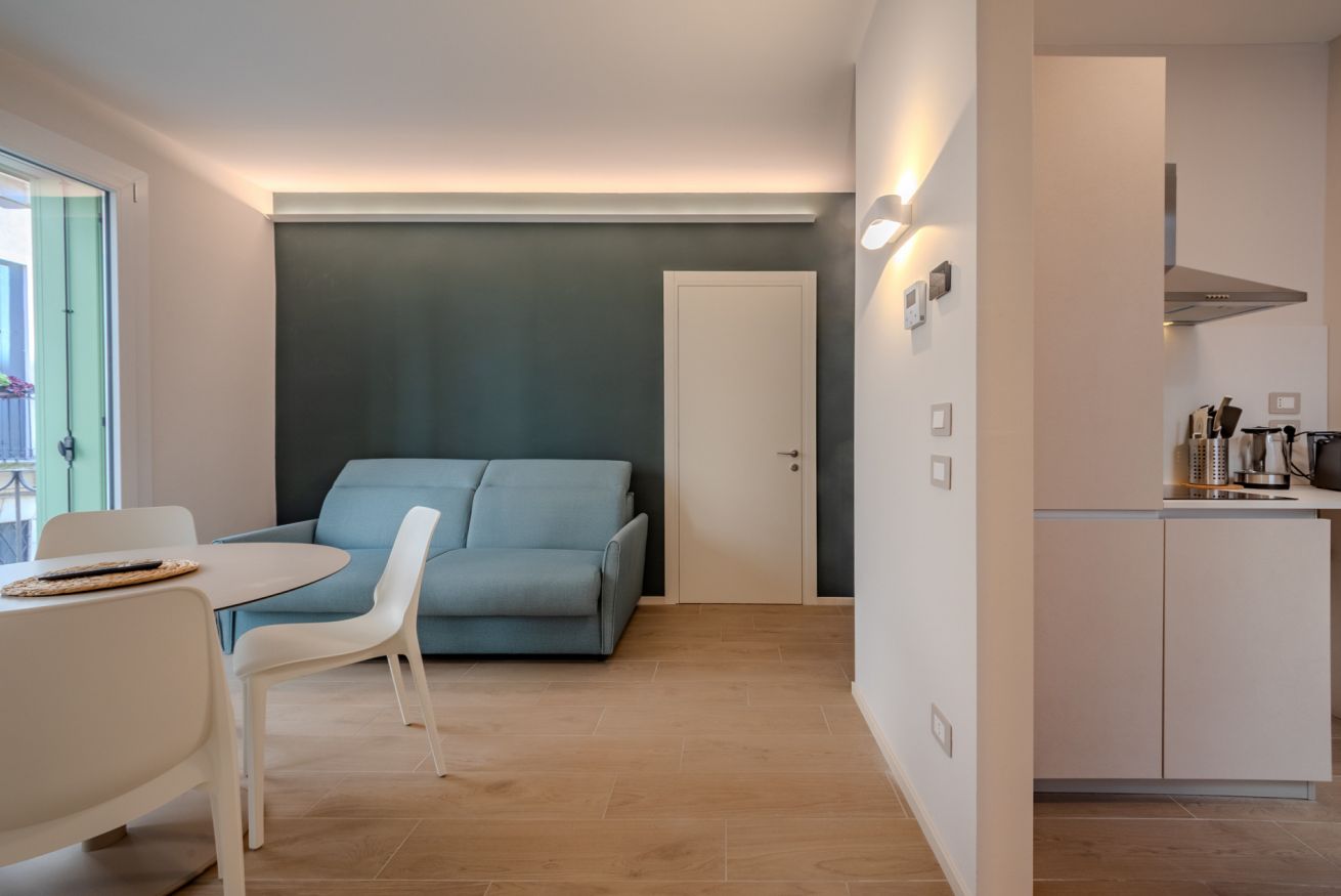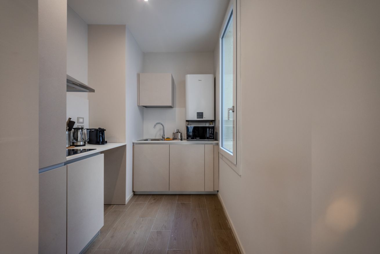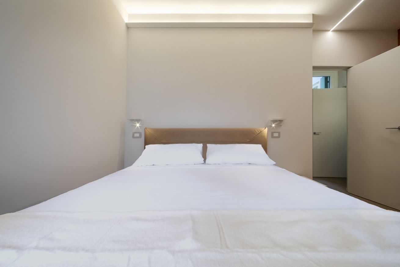 Le superfici chiare e i mobili su misura mantengono un’estetica ordinata e minimale, ideale sia per brevi soggiorni che per permanenze più lunghe.