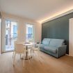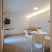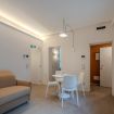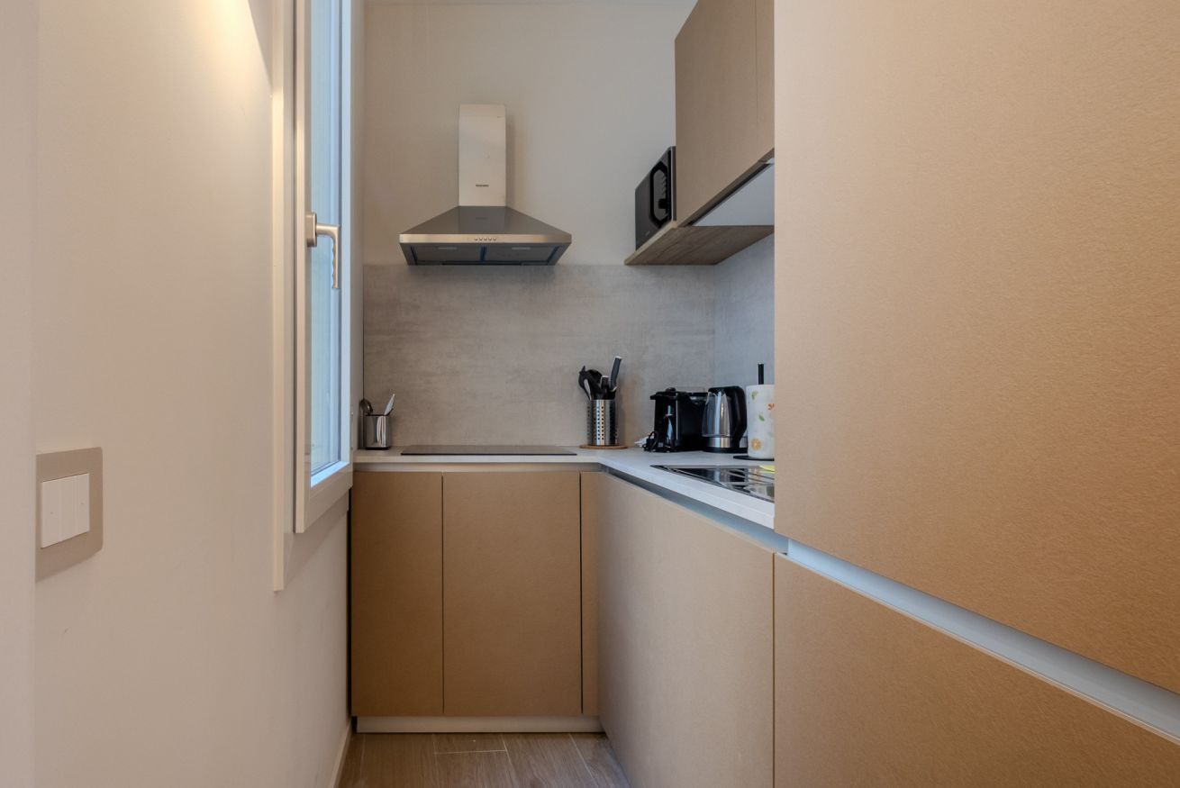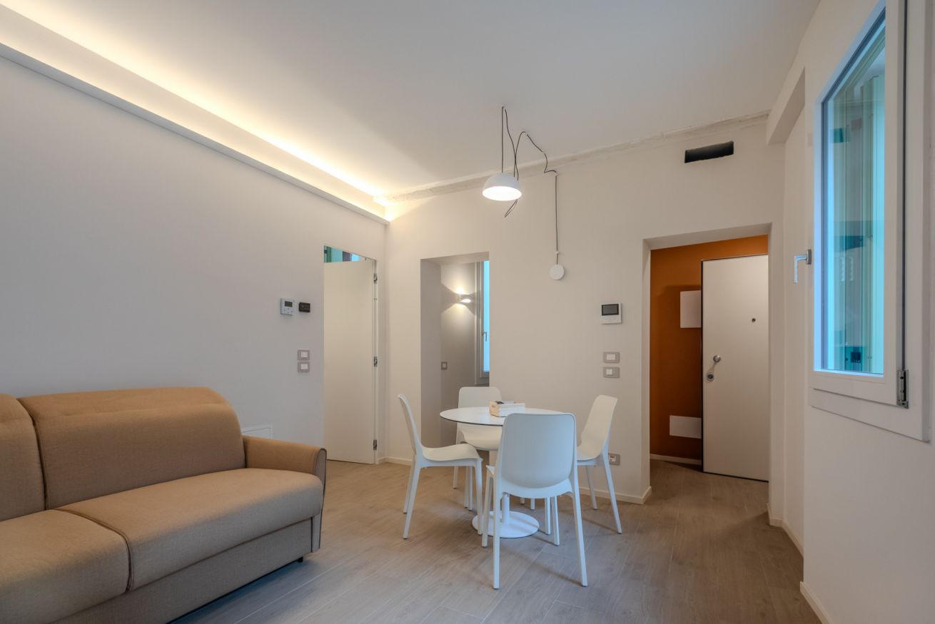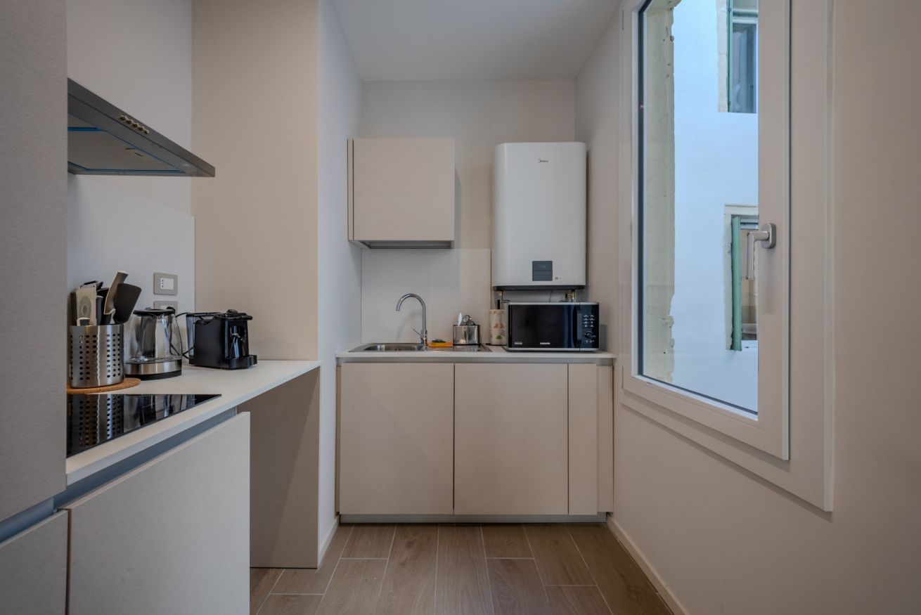 Le superfici chiare e i mobili su misura mantengono un’estetica ordinata e minimale, ideale sia per brevi soggiorni che per permanenze più lunghe.