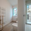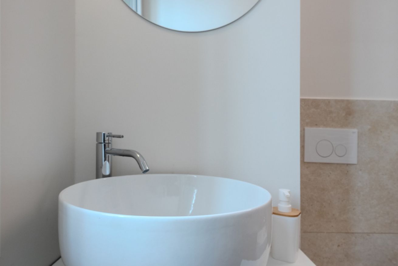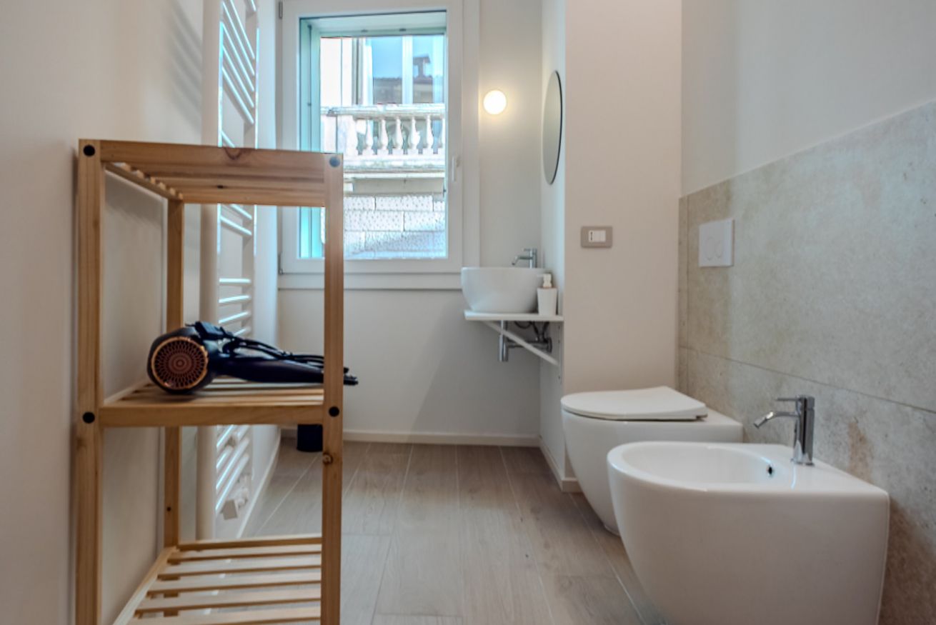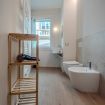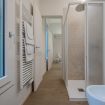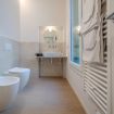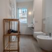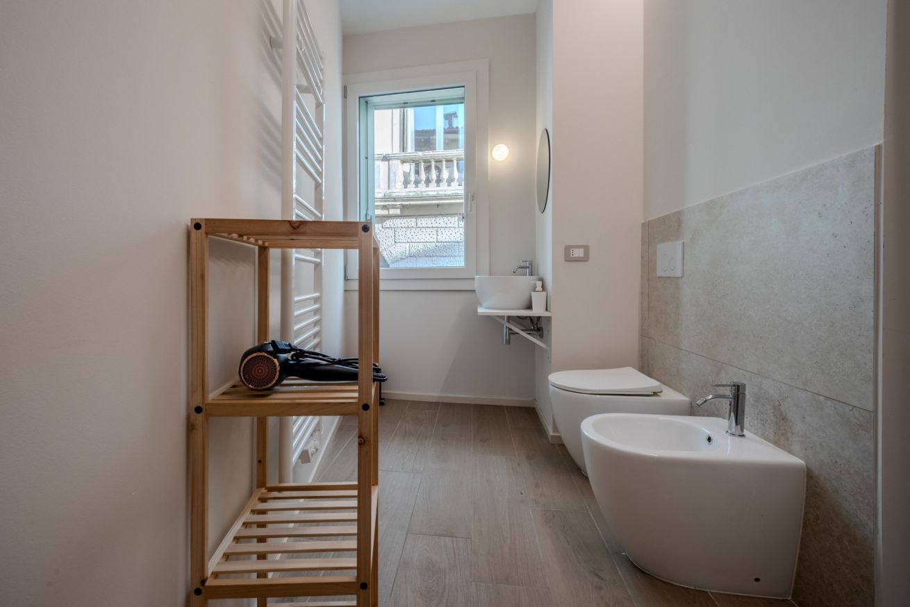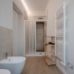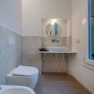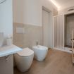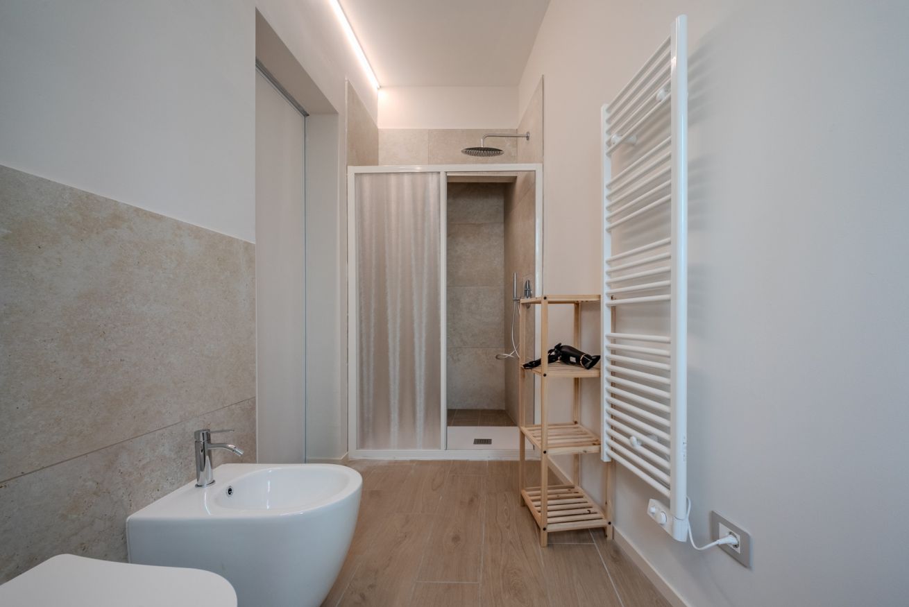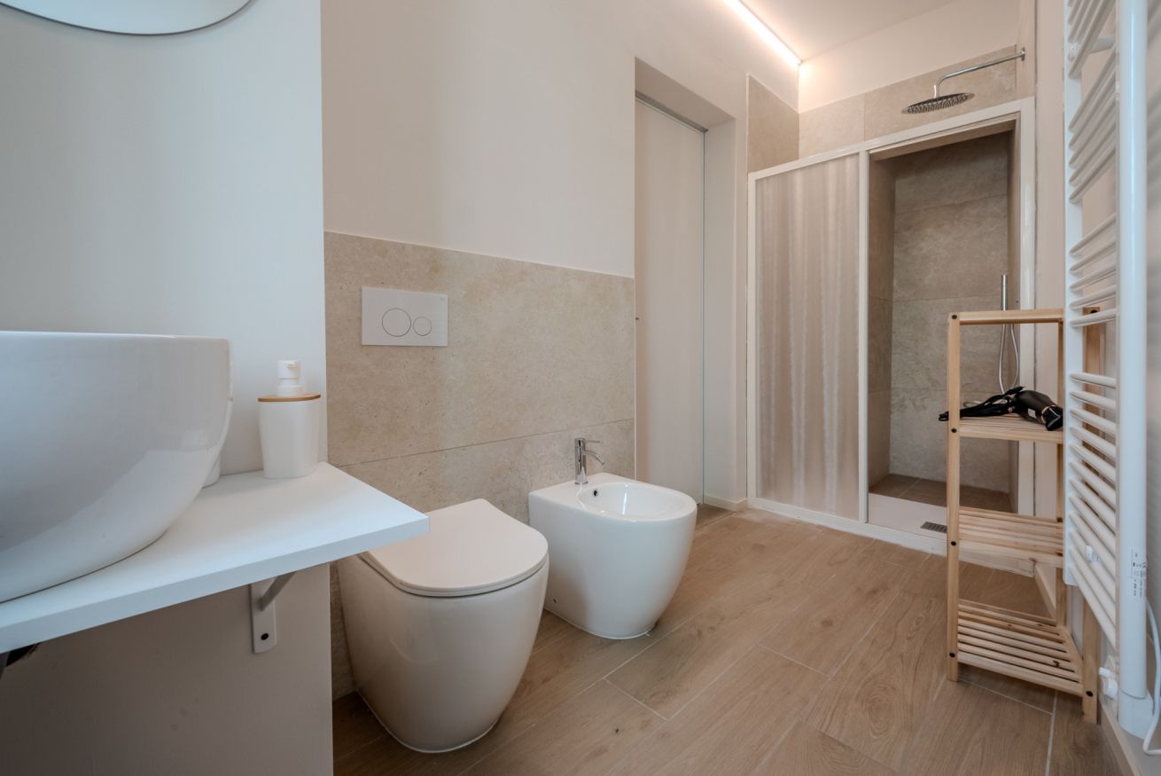 Dotato di doccia spaziosa, sanitari sospesi, lavabo di design e bidet, offre un ambiente pratico e raffinato.