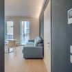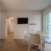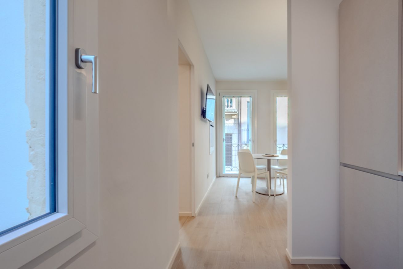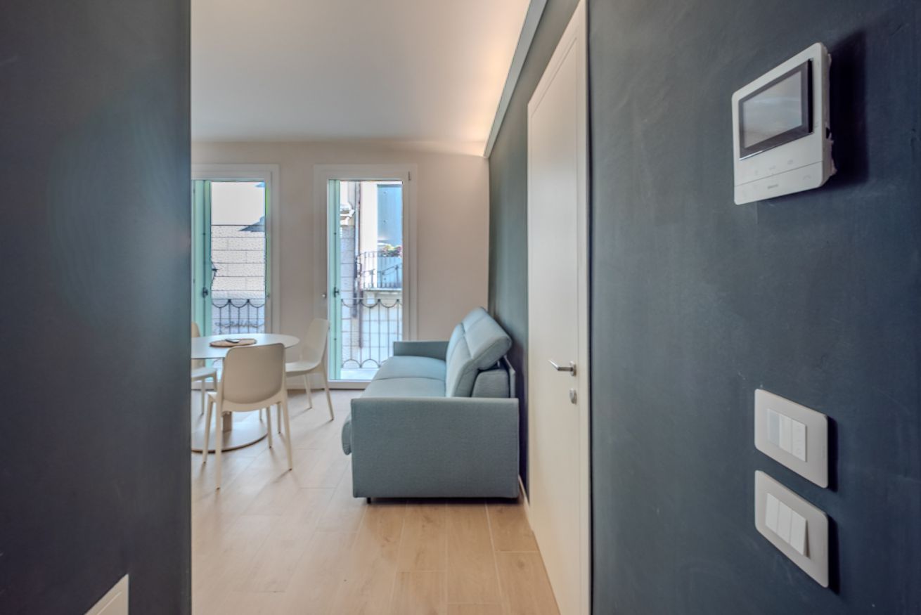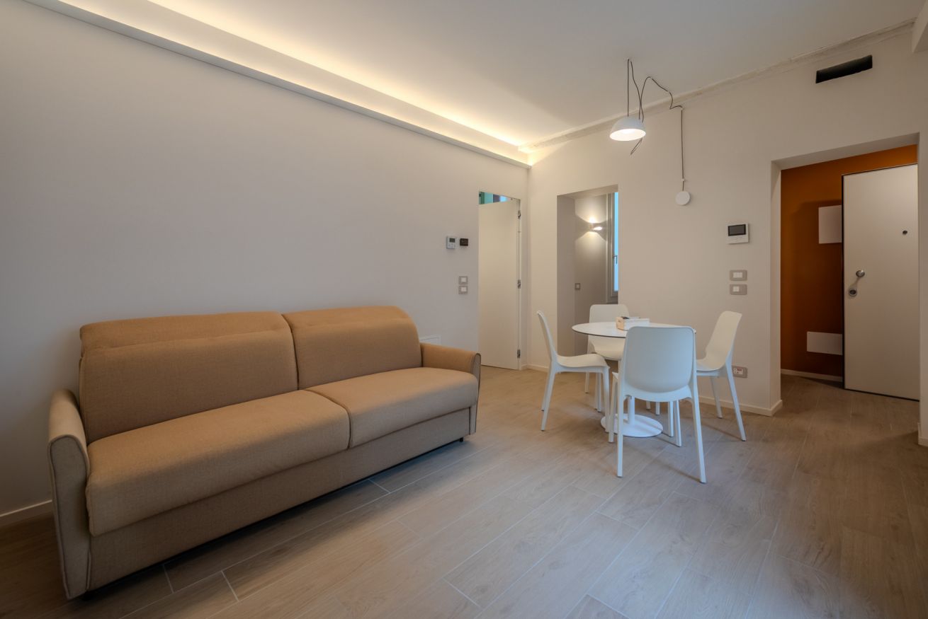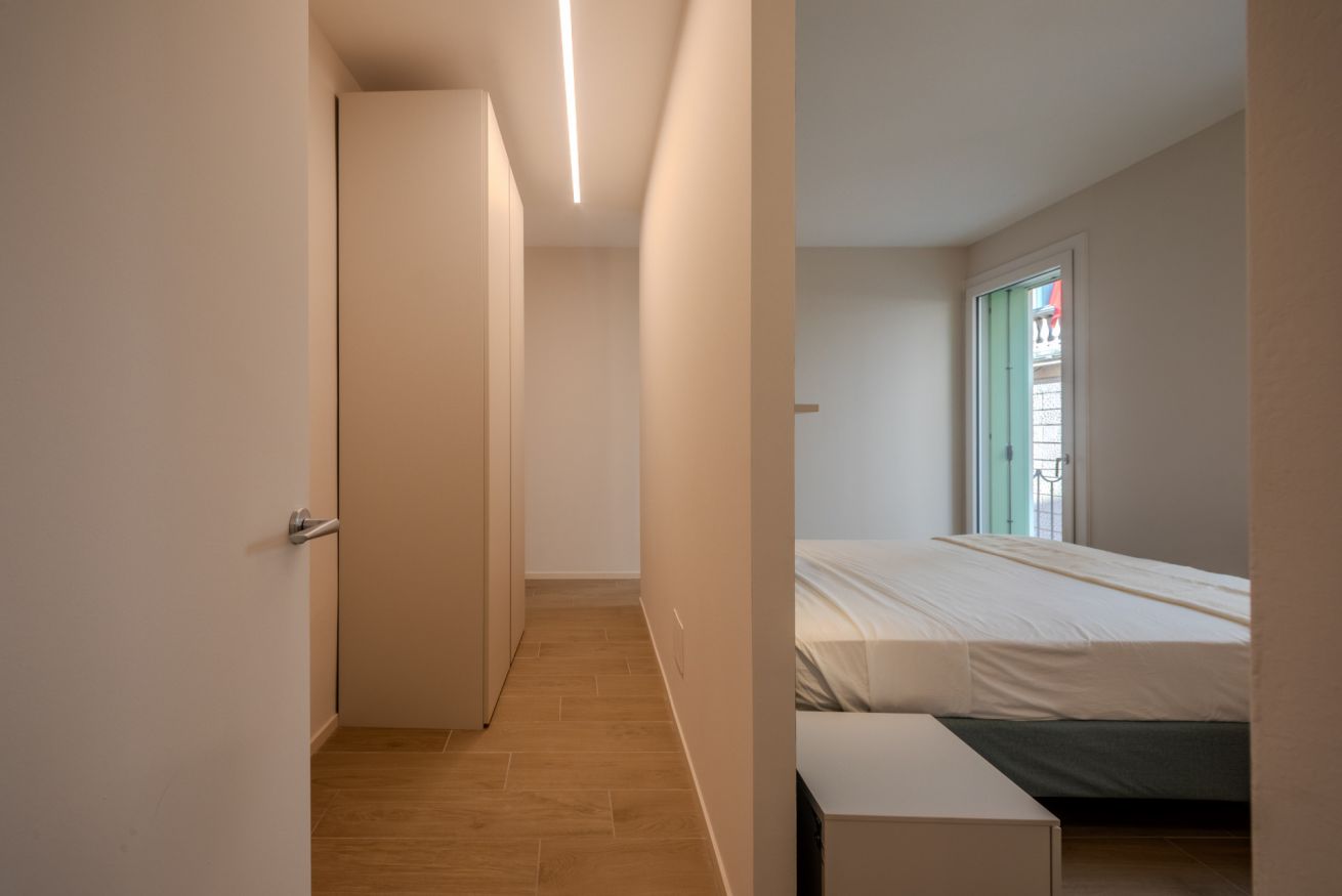 L’ingresso introduce immediatamente allo stile pulito e contemporaneo dell’appartamento. Linee essenziali, palette neutra e illuminazione discreta accompagnano l’ospite verso gli ambienti principali, creando una sensazione di ordine, calma e funzionalità. Il disimpegno separa in modo fluido la zona giorno dalla zona notte, garantendo privacy e comfort.