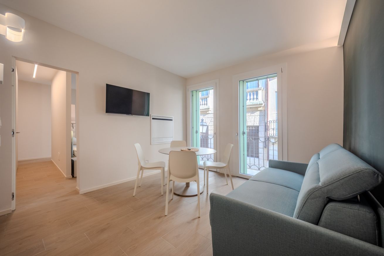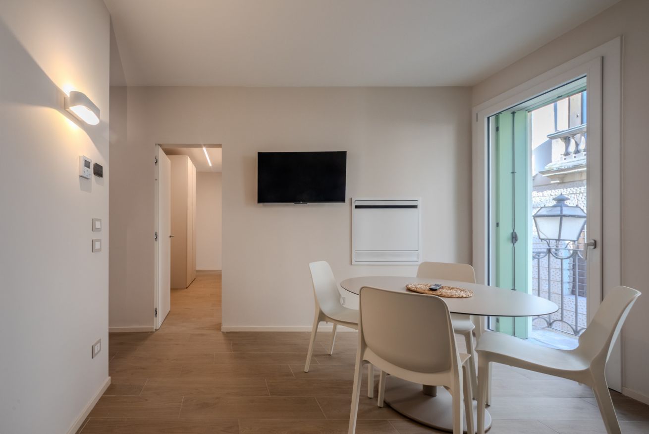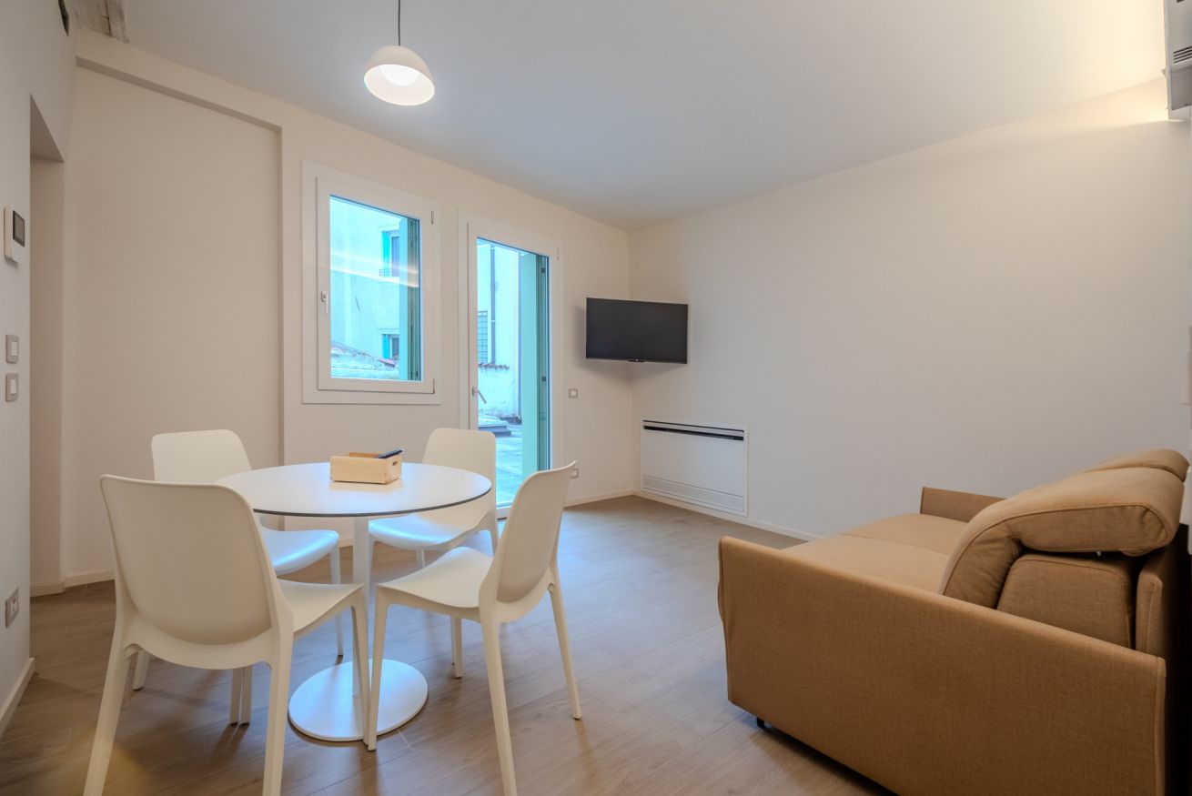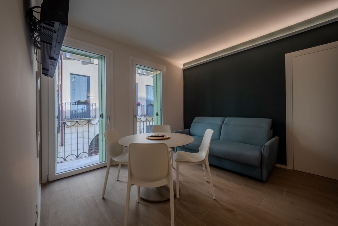 La zona giorno è luminosa e ben proporzionata, grazie alle ampie finestre che affacciano sulla storica Contrà Carpagnon.