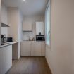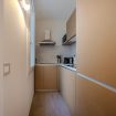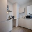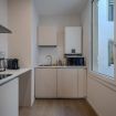 La cucina, separata ma perfettamente integrata nel layout dell’appartamento, è moderna, compatta e completamente attrezzata.