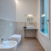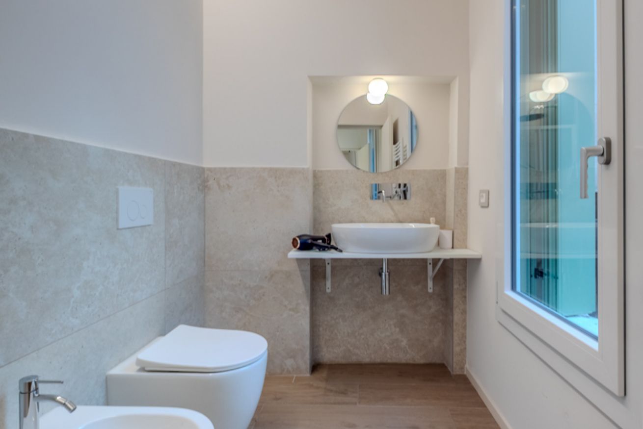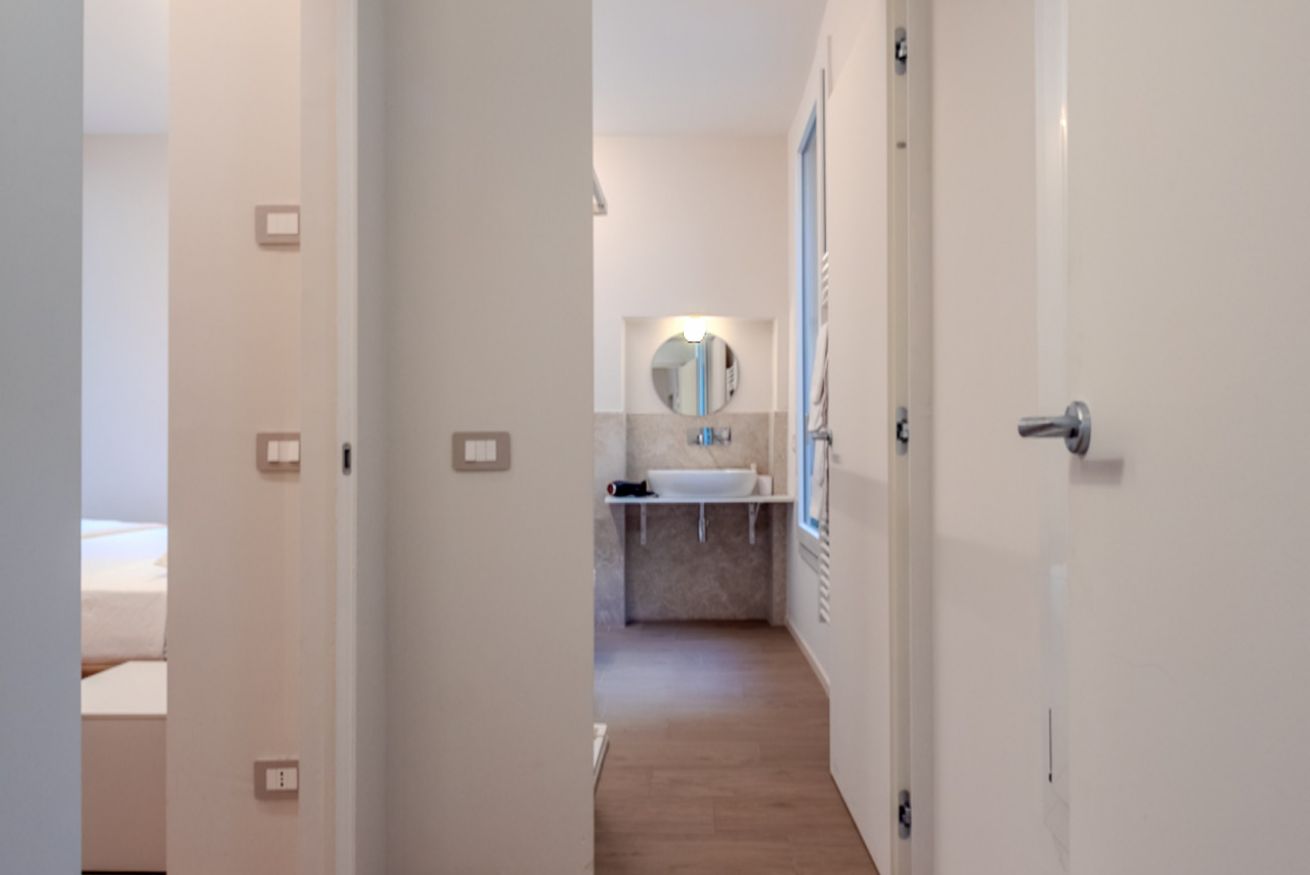 Il bagno, moderno e raffinato, è caratterizzato da materiali naturali e finiture curate. La doccia ampia, il lavabo di design e la luce morbida trasformano i gesti quotidiani in un piccolo rituale di benessere.