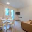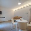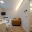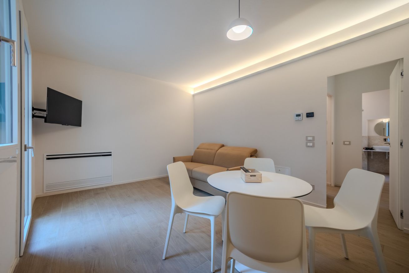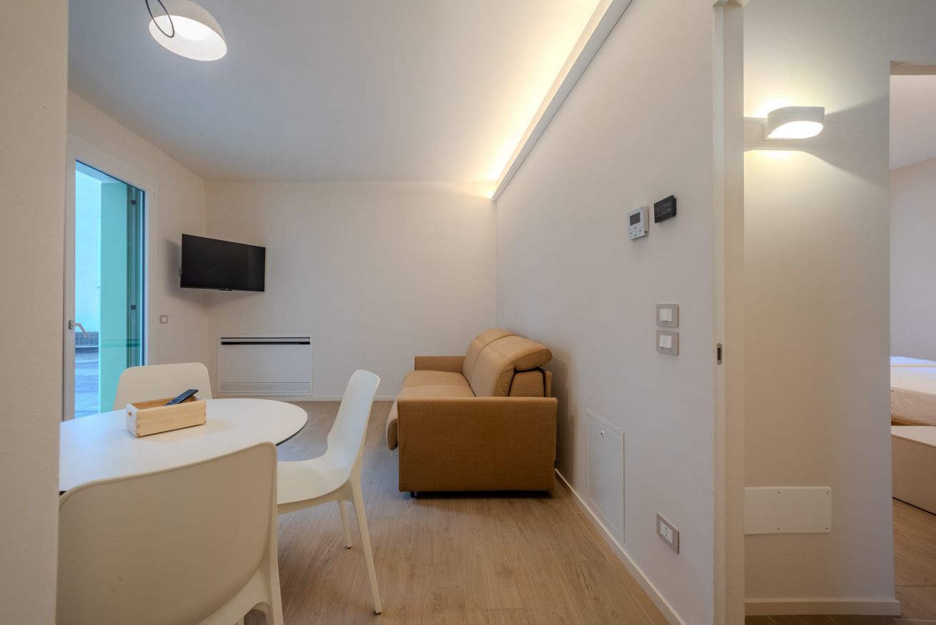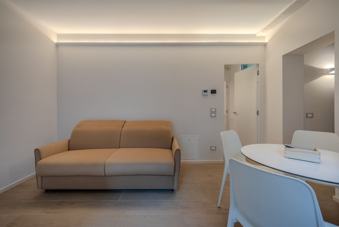Il cuore dell’appartamento è un ambiente luminoso e armonioso, dove il design contemporaneo incontra il comfort. Il divano letto, dalle linee morbide e accoglienti, invita al relax dopo una giornata in città, mentre il tavolo da pranzo crea uno spazio conviviale perfetto per colazioni lente o cene intime. L’illuminazione diffusa valorizza ogni dettaglio, rendendo l’atmosfera calda e rilassante.